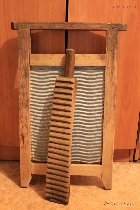 На ней – стиральная доска и... Авторы, очевидно решили, что это вариант стиральной доски. Но это другой предмет. Это – рубЕль. В сочетании с качалкой – приспособления для глажки, а вовсе не для стирки.